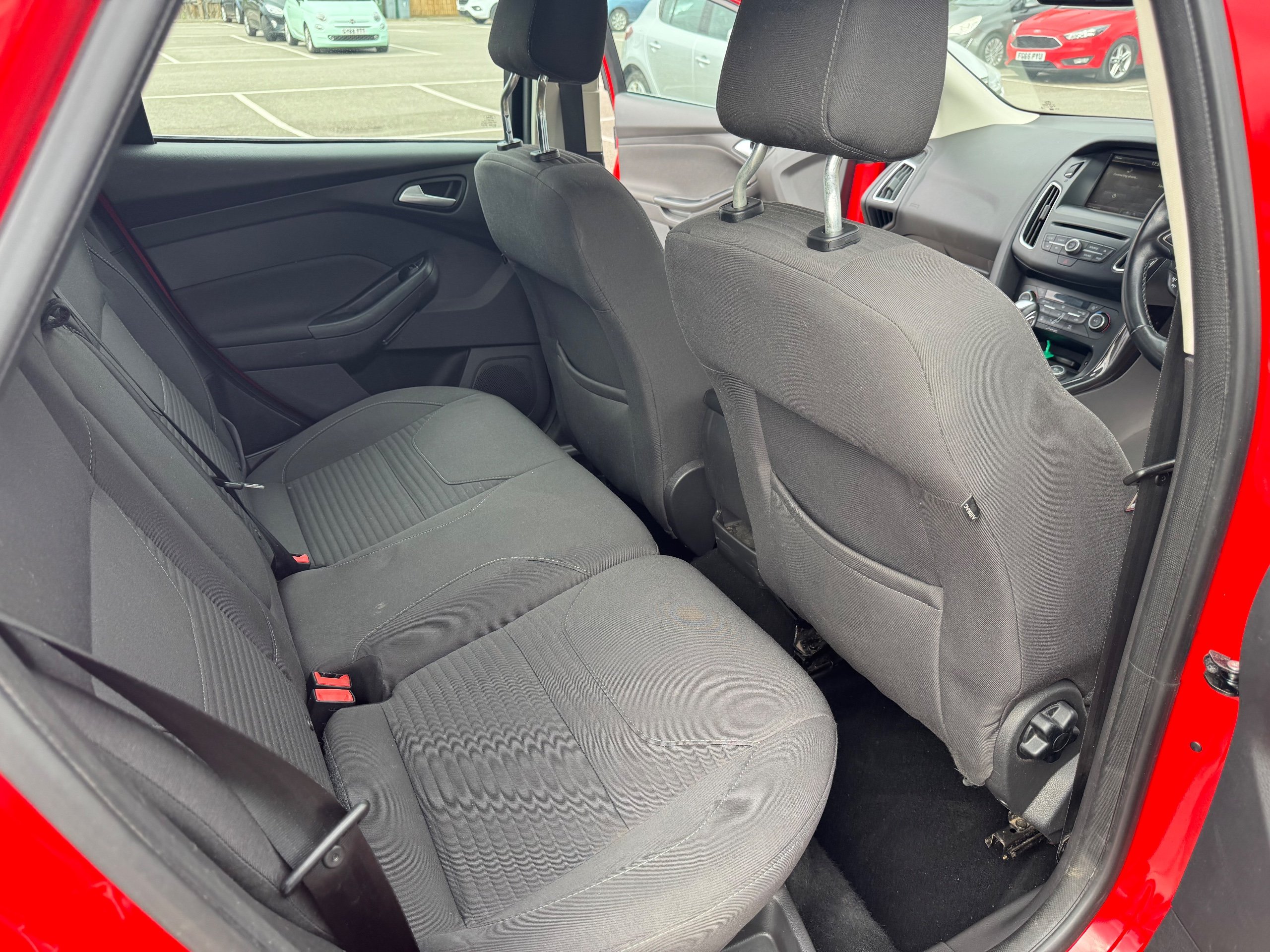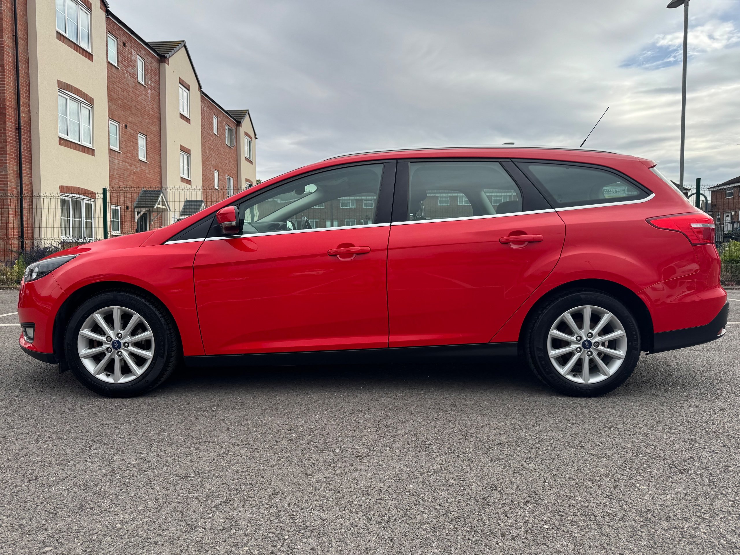 Inside, the Focus Titanium features dual-zone electronic climate control, sports-style front seats, a 60/40 split-folding rear bench, centre armrest with storage, leather steering wheel, height-adjustable seats, and silver roof rails for added versatility. The spacious estate boot makes it an excellent choice for families and travellers.